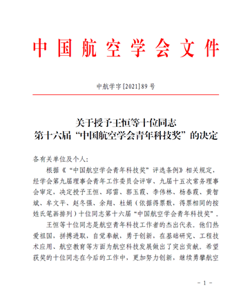 2021年11月3日,中国航空学会正式公布《关于授予王恒等十位同志第十六届“中国航空学会青年科技奖”的决定》文件,动漫疯
