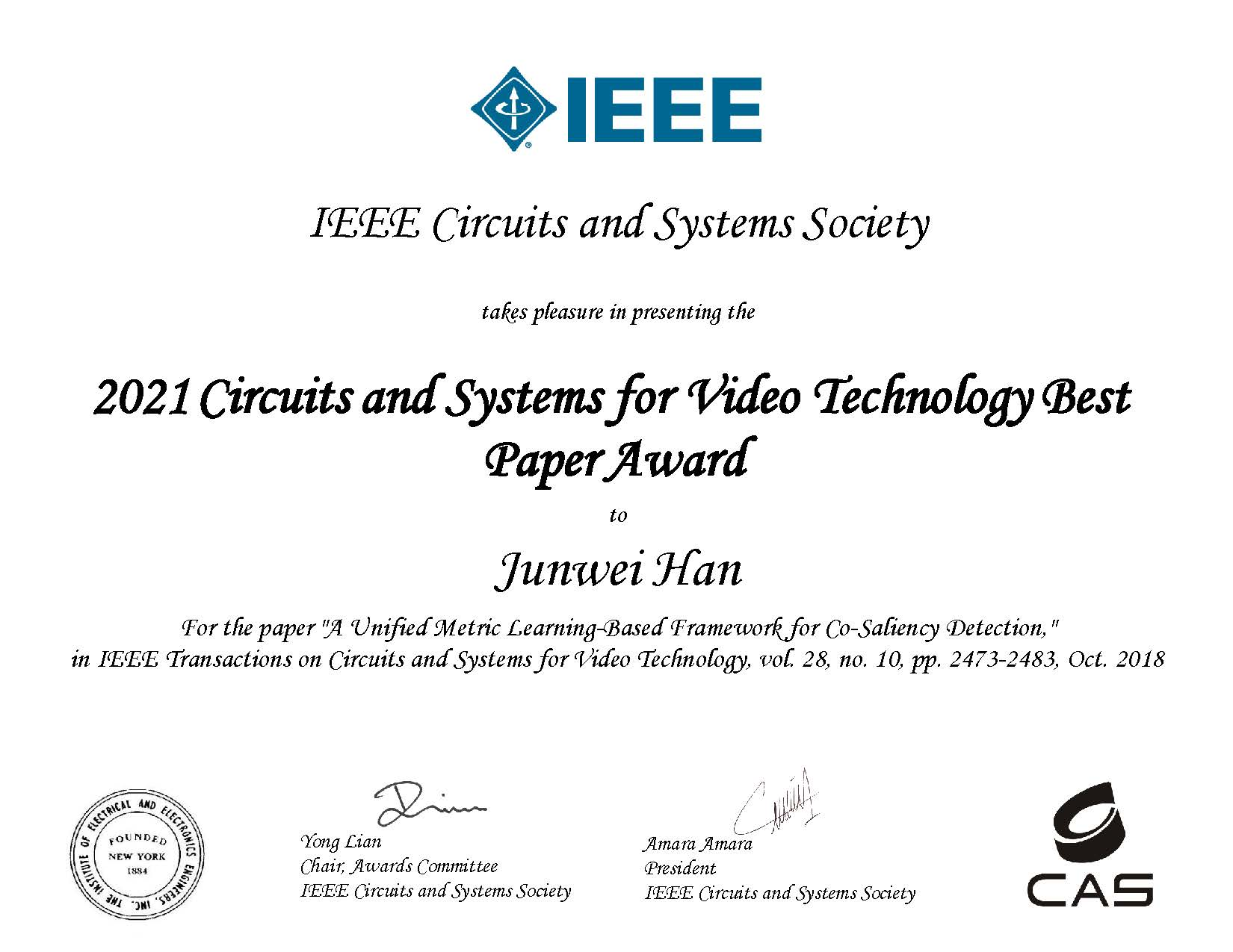 近日,我院脑与人工智能研究团队韩军伟、程塨教授等合著的论文“A unified metric learning-based framework for co-saliency detection”获得多媒体领域顶级国际期刊《IEEE电路系统视频技术汇刊》(IEEE Transactions on Circuits and Systems for Video Technology, TCSVT)2021年度最佳论文奖(Best Paper Award)。