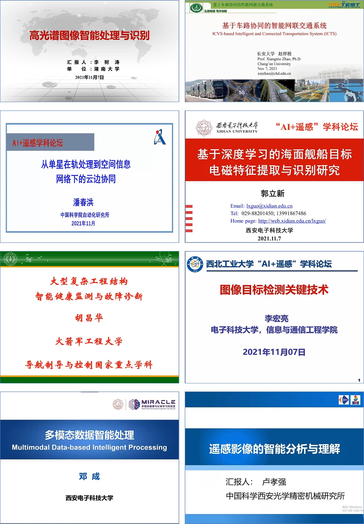 湖南大学李树涛教授分享了高光谱图像智能处理与识别的相关研究,长安大学赵祥模教授介绍了基于车路协同的智能网联交通系统,中国科学院自动化研究所潘春洪研究员分享了从单星在轨处理到空间信息网络下的云边协同,西安电子科技大学郭立新教授介绍了基于深度学习的海面舰船目标电磁特征提取与识别研究,火箭军工程大学胡昌华教授分享了大型复杂工程结构智能健康监测与故障诊断,电子科技大学李宏亮教授分享了图像目标检测技术,西安电子科技大学邓成教授分享了多模态数据的认知与推理,中国科学院西安光学精密机械研究所卢孝强研究员报告了遥感影像的智能分析与理解,动漫疯