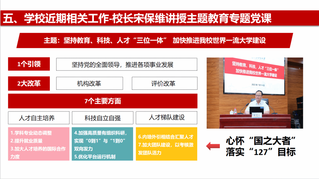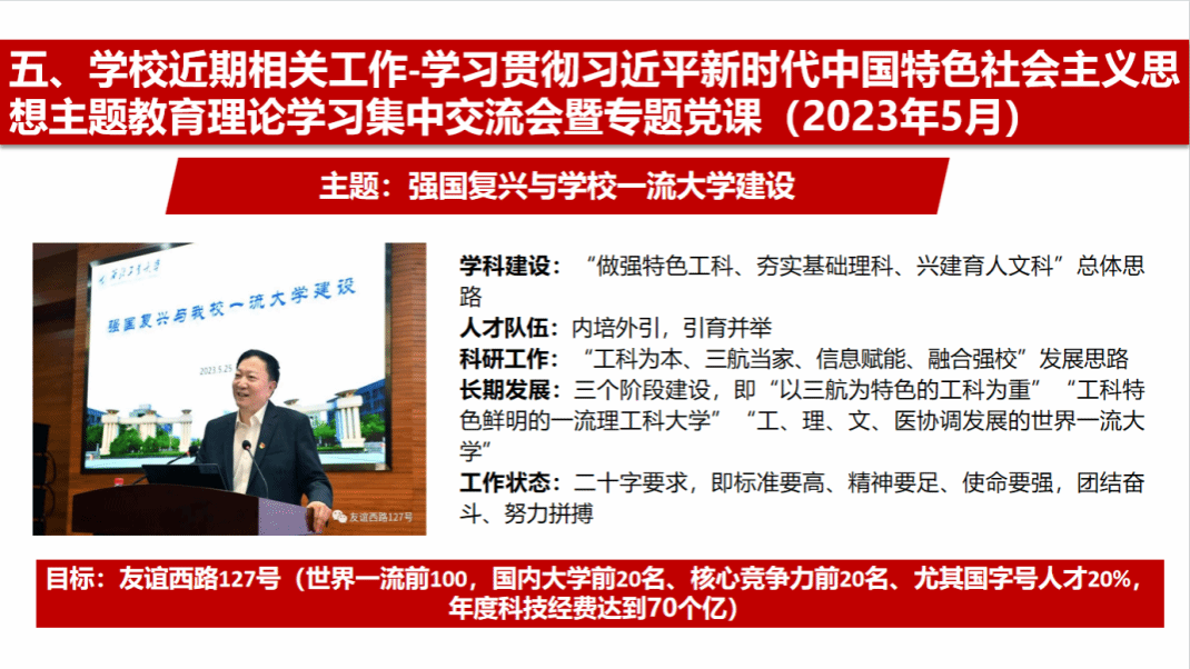李伟林重点从主题教育背景、理论学习宣贯、调查研究情况、心得思路举措、师德警示教育五个方面讲授专题党课。党课主要从开展主题教育重大意义、总要求、根本任务和目标要求等方面阐述了主题教育背景,并结合学校党委关于开展常态化理论宣讲相关工作要求开展理论宣讲;党课结合学院落实“四项行动计划”具体实际,聚焦学院发展重点难点问题,集中学习了学校党委书记李言荣、校长宋保维主题教育专题党课精神;党课紧密围绕主题教育调查研究部署安排,从顶层设计、实施情况、调研成果运用及发展思路举措等方面详细介绍了学院调查研究及推动发展情况。