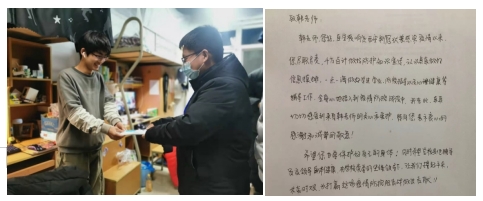 在担任研究生辅导员期间,韩渭辛时刻谨记“以学生为中心”的理念,从学生的学习指导、日常管理再到情绪安抚,他都密切关注、深入指导,竭尽全力只为给同学们提供最暖心的帮助。在2021年底疫情期间,韩渭辛前往学校星D支援,对接大学生超市开展物资订购发放工作,为同学们的日常生活提供了扎实保障。那段时间,他既是“搬运工”,又是“理货员”,还是“营业员”,更是学生口中的暖心“客服”。当时,2020级能源动力专业的同学还特意为他送上了手写信,以示感谢。