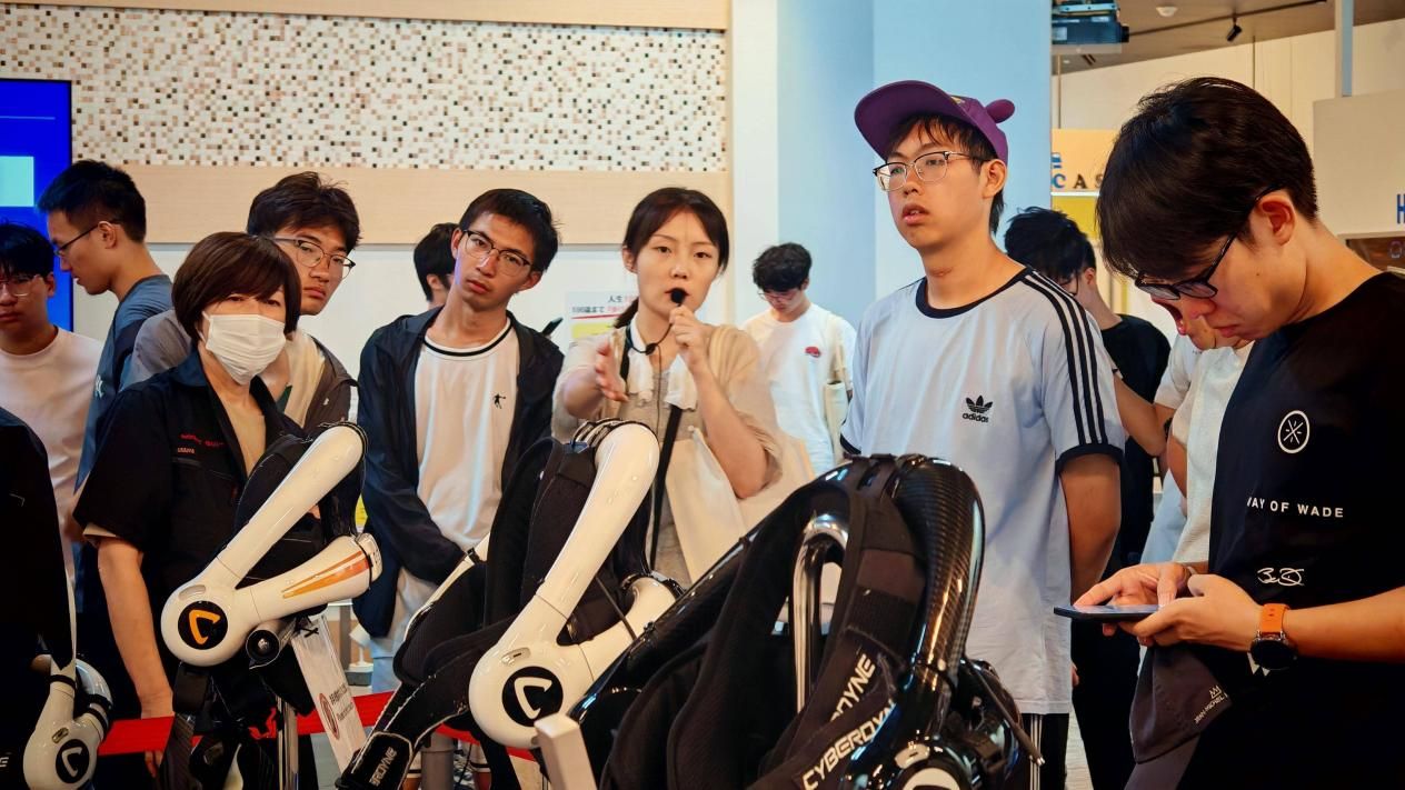 访学期间,同学们深入探访了日本科学知识高地——筑波科学城以及CYBERDYNE等。大家首先走进筑波科学城内的国立自然科学博物馆,馆内珍藏着大量自然科学领域的标本与文物,涵盖地质、生物、天文等多个学科。同学们逐一参观,系统了解了地球的演化历程、生命的起源以及人类进化的奥秘。在CYBERDYNE,技术人员简要介绍了HAL的基本原理:通过贴在人体皮肤表面的传感器检测肌肉活动时产生的微弱生物电信号(肌电信号,EMG),系统识别出佩戴者的运动意图。同学们在工作人员的指导下,亲自尝试佩戴使用外骨骼设备,深切感受着设备的灵活与可控性。