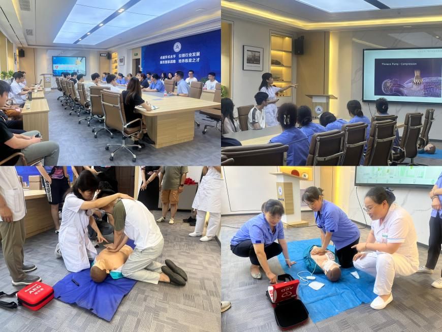应急救护培训环节,校医院程飞医生一行为学院师生代表、后勤值班人员作培训指导。培训师重点讲解了心肺复苏术+AED(自动体外除颤器)的操作流程、气道异物梗阻排除法以及海姆立克急救法等救护知识,并组织参训人员现场逐一参与模拟演示。现场讲师及时纠正大家的不规范动作和急救误区,有效增强了师生的应急知识储备,提升紧急救护能力。