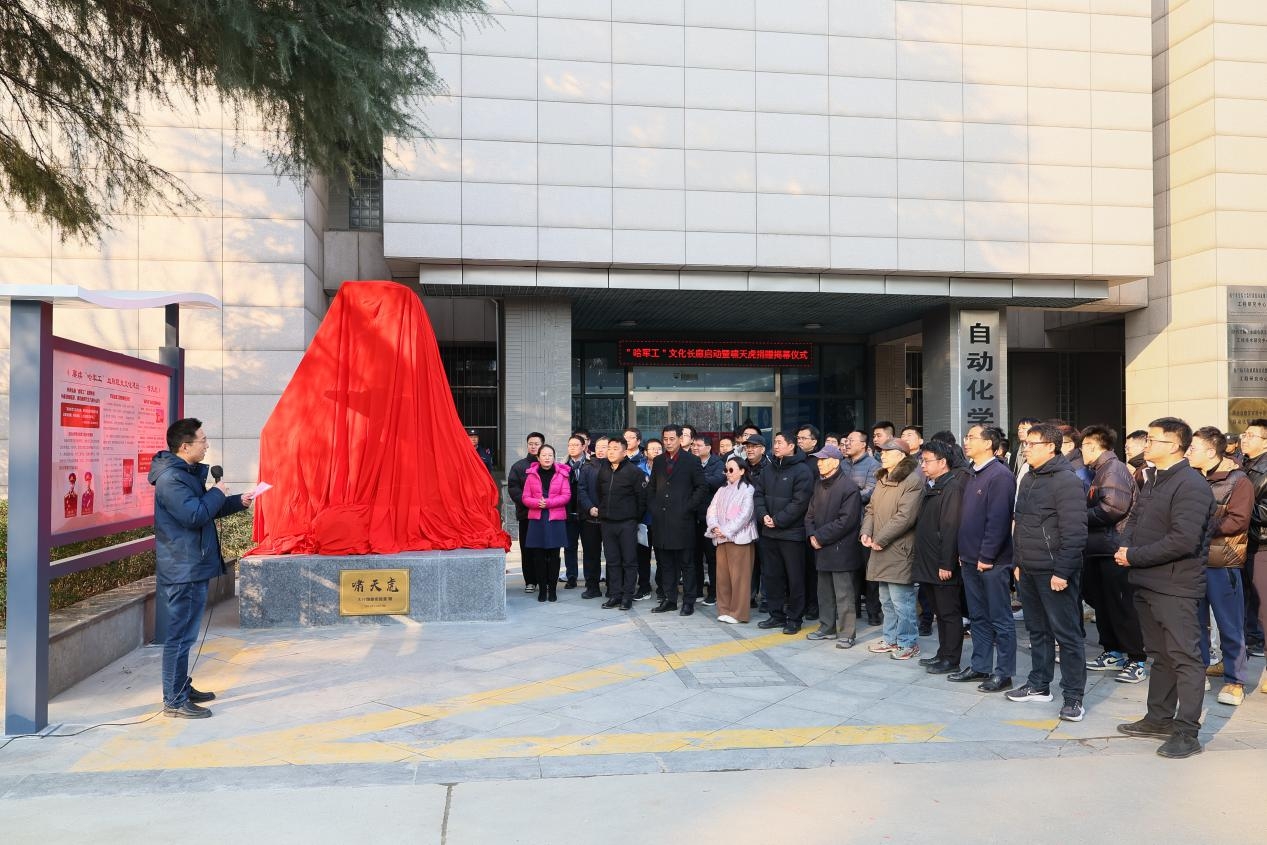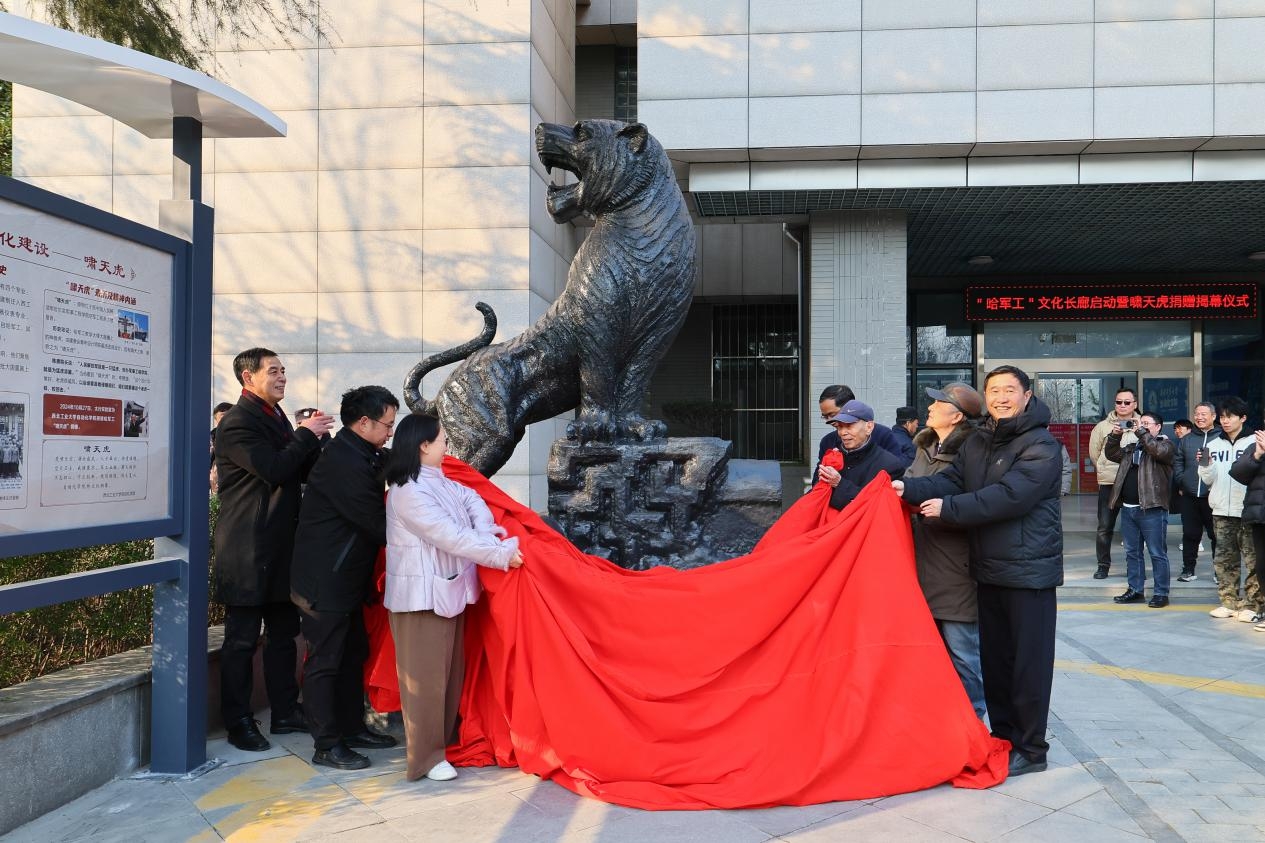 校领导、捐赠代表、“哈军工”学员代表、师生代表等共同为“啸天虎”铜像揭幕。