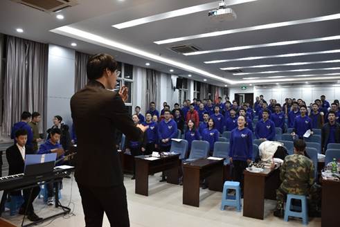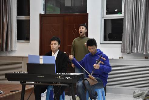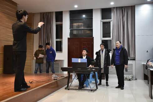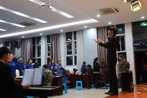 楼里便常常传出乐声。在原本用来休息小憩的中午、刻苦学习的夜晚、轻松愉快的周末,师生们都辛勤付出参与排练。指挥老师陈鑫博耐心而富有经验,既把控全局,从发声共鸣开始引导同学们用正确的方式歌唱;又关注细节,把每个同学都安排在合适的声部,各取所长。所有参与的师生都齐心协力,奋力进取。