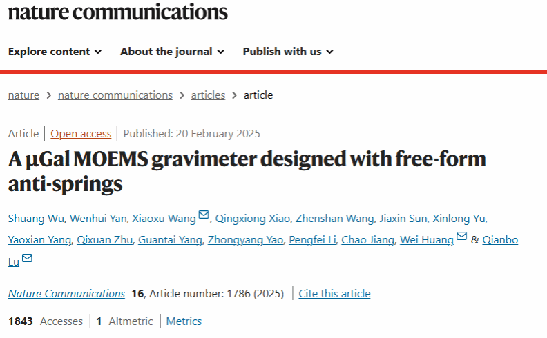 近日,学院控制科学与工程学科2023级博士研究生吴霜、2021级博士研究生闫文辉依托“智能惯性传感与系统”团队(团队负责人王小旭教授),以共同第一作者在国际著名期刊《Nature Communications》发表了题为“A μGal MOEMS gravimeter designed with free-form anti-springs”的研究论文,标志着学院在MOEMS相对重力仪领域取得重要进展。