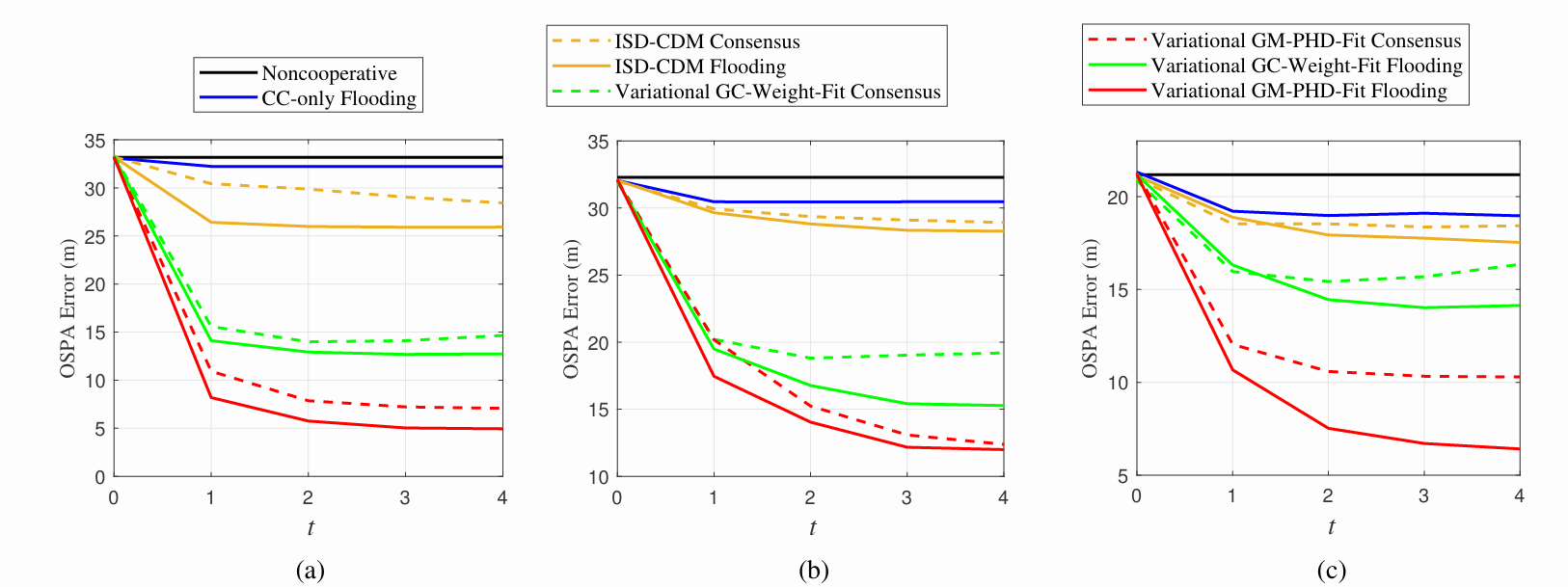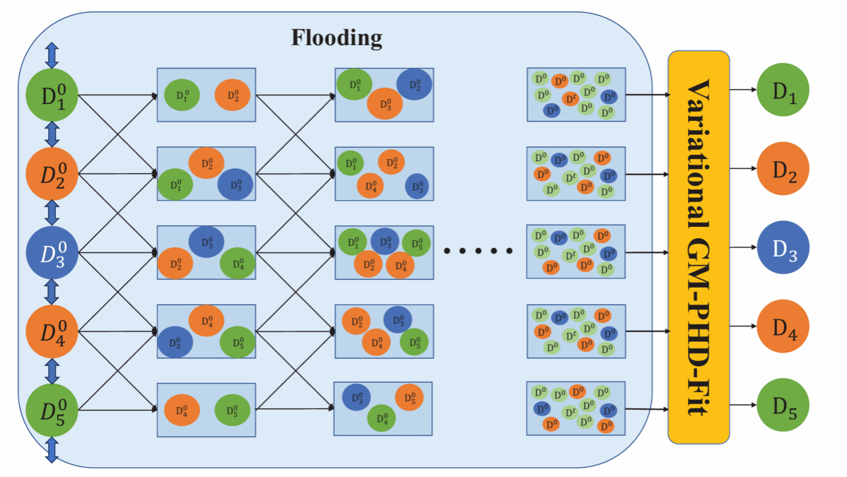 针对此问题,本论文考虑了三种最常见的RFS滤波器的分布式融合场景,分别为高斯混合概率假设密度滤波器(GM-PHD filter)、多伯努利滤波器(MB filter)以及标签多伯努利滤波器(LMB filter)。在本论文的前序部分《Arithmetic Average Density Fusion- Part II: Unified Derivation for Unlabeled and Labeled RFS Fusion》中作者已证明,所有RFS滤波器之间多目标概率密度(MPD)的算术均值(AA)融合其本质均为概率假设密度(PHD)融合,而PHD融合可以获得对任意区域内目标数量的一致性估计。在本论文中,三种RFS滤波器的异构MPD均被转换为PHD并进行AA融合。随后,为保证各个滤波器的闭合性,需要通过最小化KL散度来将融合后PHD中的信息反馈至本地滤波器的MPD中,而两者均为高斯混合分布的形式,KL散度不存在解析解。为此,作者采用了变分近似方法推导出KL散度的变分上界,通过最小化变分上界实现了由PHD至MPD的信息反馈,最终得到两种优化方法:variational GC-weight-fit 与variational GM-PHD-fit。前者仅优化本地MPD中高斯组件的权重,计算量较小。后者优化本地MPD的所有参数,因而精度更高。实验表明本文所提方法大幅提升了三种滤波器的跟踪精度,首次实现了异构RFS滤波器的分布式协同,填补了这一领域的空白。此研究的亮点工作在于摆脱了在MPD层面寻求融合方法的定式思维,转而在PHD公共空间进行AA融合并将信息反馈回异构MPD中,为概率密度融合领域打开了新思路。