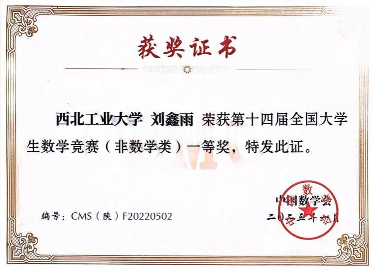 获第十四届大学生数学竞赛陕西赛区一等奖