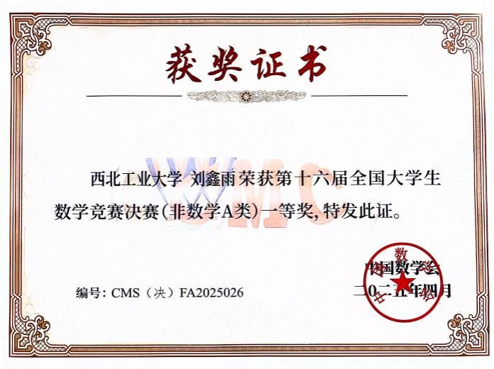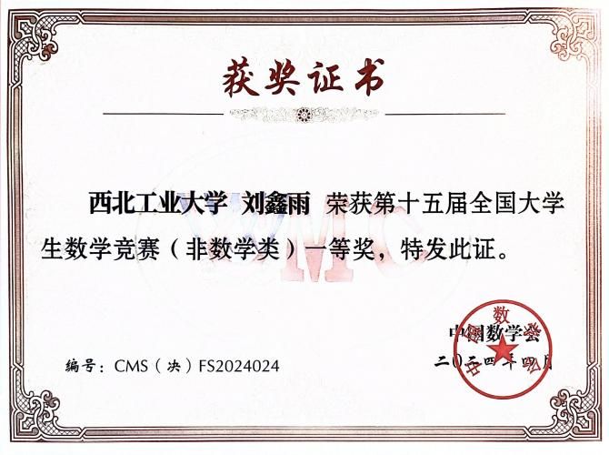 在今年4月举办的第十六届全国大学生数学竞赛中,刘鑫雨不骄不躁,凭借着日常积累与超强心态,逐级过关,最终在决赛中经过与1229名竞争者的激烈角逐,成功荣获第十六届全国大学生数学竞赛决赛(非数学A类)一等奖。值得一提的是,他已经连续两年在全国大学生数学竞赛决赛中荣获一等奖了。