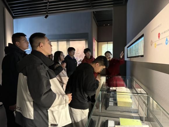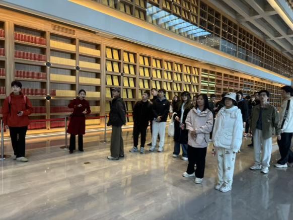 在讲解人员的带领下,同学们首先来到版本馆园林区域和序厅,了解了版本馆的设立背景、重要意义,以及“山水相融、天人合一、汉唐气象、中国精神”的设计理念和“方正、大气、典雅”的建筑格局。随后,同学们参观了《楮墨遗珍 万里同风——丝绸之路版本展》和《赓续文脉 踔厉前行——中华文化经典版本展(西部篇)》两个常设特色展厅,感受丝绸之路文明和中华文化版本的深厚底蕴,感悟延安精神和民族复兴版本的红色血脉。