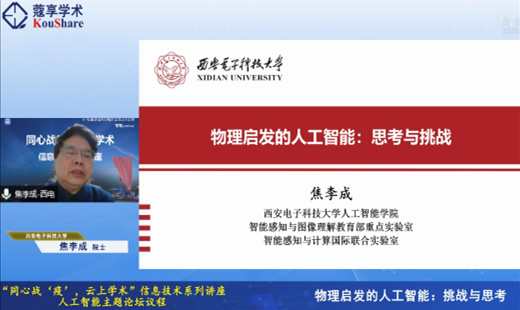 欧洲科学院、俄罗斯自然科学院焦李成院士作题为《物理启发的人工智能:思考与挑战》的精彩学术报告。焦院士从人工智能的发展渊源于思想起源、经典力学启发的学习理论、电磁学启发的学习理论、统计力学启发的学习理论、量子力学启发的学习理论,以及思考与挑战等多方面,宏观讲解在物理学基础上的人工智能发展方向,提供了人工智能发展的全新视角。