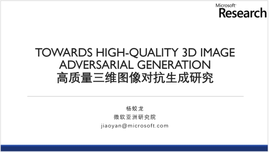 来自微软亚洲研究院的杨蛟龙研究员作题为“感知三维的对抗图像生成”的报告。杨蛟龙研究员首先介绍了感知三维的对抗图像生成的问题定义和基本思路,指出了感知三维的对抗图像生成中常见的内存限制、图像质量差等问题。针对这些问题,他分享了团队在该问题上的三项研究工作,包括一种使用少样本生成高质量感知三维的对抗图像的方法、一种用2DCNN生成高分辨率三维感知图像的方法和一种能够精准控制目标面部属性的人脸图像生成方法,并展示了这些方法的卓越效果。