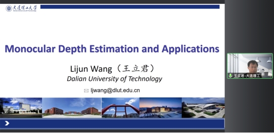 来自大连理工大学的王立君副教授作题为“单目图像深度估计”的报告。王立君副教授首先从网络结构设计和学习策略两个方面,介绍单目图像深度估计的基本知识,然后介绍了团队在单目图像深度估计方面的相关研究成果,分析讨论如何更好地理解场景语义、更好地优化深度网络、更有效地学习尺度一致深度信息,并在最后进行了简要的总结和展望。