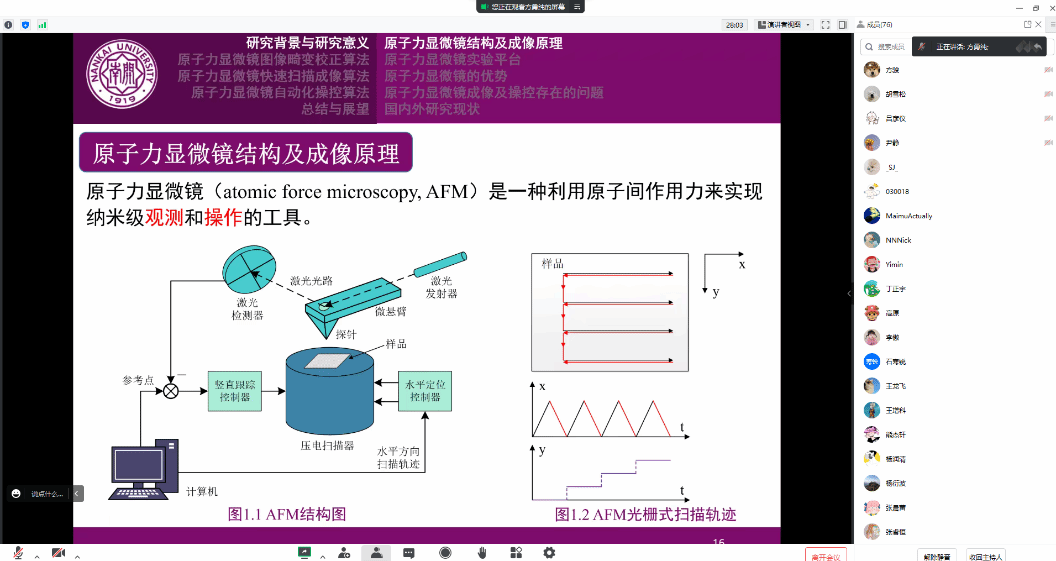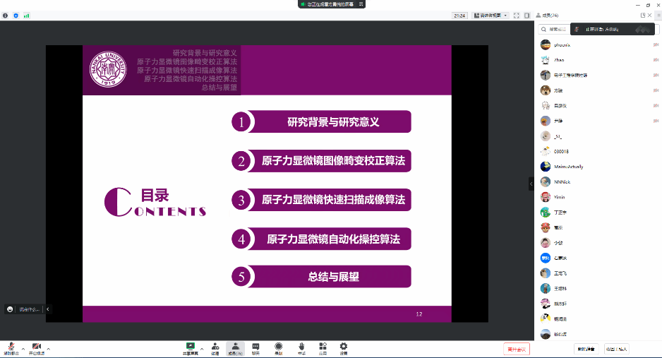 举办南山青年学术论坛(第七十四讲),特邀南开大学方勇纯教授开展了题为“原子力显微镜成像策略与自动操控方法研究”的线上学术报告。共100余名师生参加了此次报告会。本次报告会议由学院李琳副教授主持。