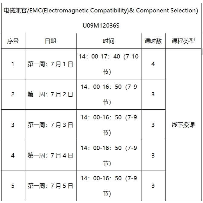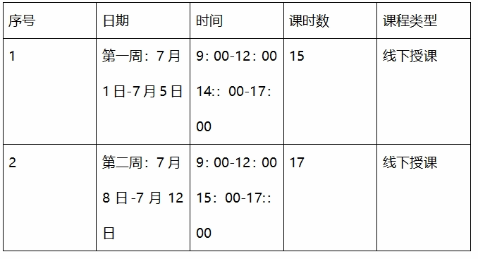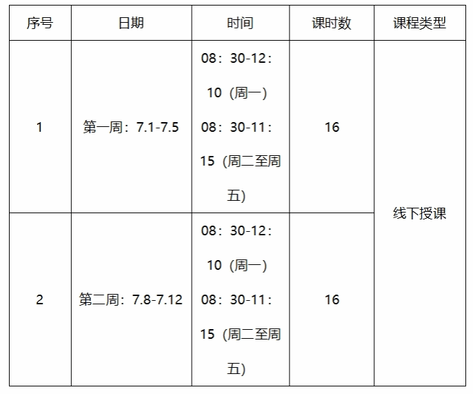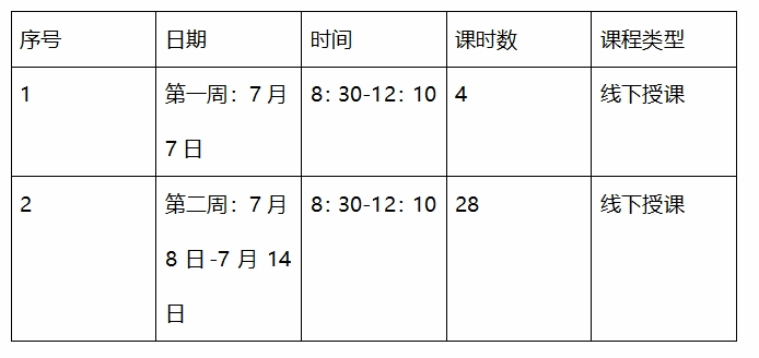 时间安排:7月1号上午和下午,2,3,4上午,8号上午和下午,10号上午。上午和下午上课时间均为1、2节。第二周的周末交课程报告。