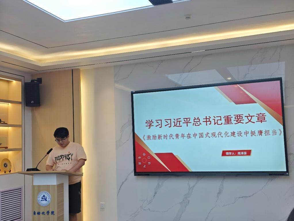 支部副书记高泽源领学了习近平总书记重要文章《激励新时代青年在中国式现代化建设中挺膺担当》,强调青年一代必须坚定不移地筑牢自身的理想信念根基,积极发扬勇于探索、敢于创新的精神,以坚定的决心和不懈的努力,勇攀科技领域的高峰,不断攻克科技难题,为国家的科技进步和社会的发展贡献青春力量。