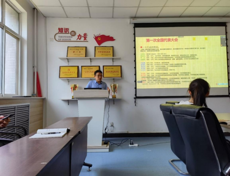 首先,由支部书记陈森同志主持发言,讲解了本次活动的目的及意义,并邀请唐老师为支部党员开始讲授党课。接着唐老师根据党的发展历程,依次从党的一大开始到党的十九大进行详细讲解。从每次会议召开的历史背景、我党在逆境中面临的考验与挑战展开,到每次会议取得的主要历史功绩及党中央领导机构的变革与发展,全体党员同志深刻感受到党的百年征程中的波澜壮阔,百年初心历久弥坚。