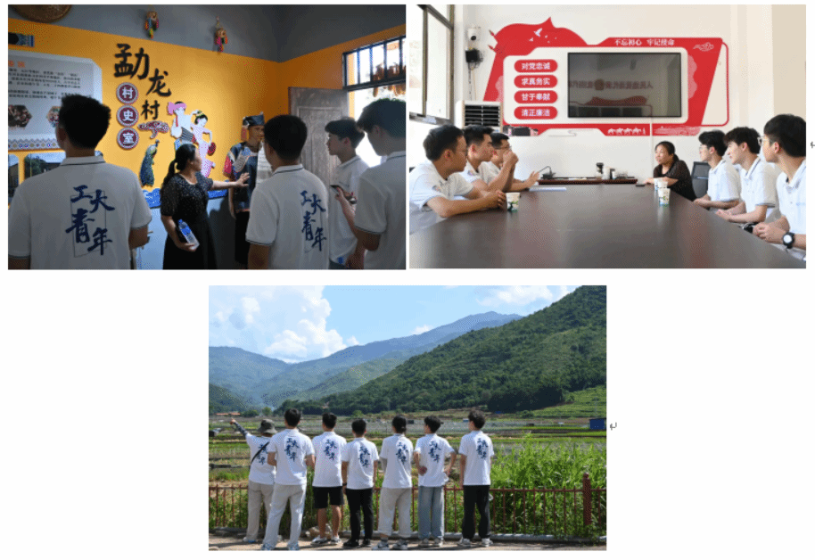 实践队抵达红河县后,首站便来到以傣族为主体的勐龙村。这里不仅是全国文明村,更是云南省美丽乡村建设的典范。村委会深入组织“五个普及”“三话六学”活动,创新落实“一联三会四落实”工作方法,不断强化基层思想政治建设,为高质量发展注入动力。村委会成员白海仙带领队员们参观了民族团结公约墙和村史馆,并细致讲解了这座大山深处傣族村寨独特的风俗习惯与发展脉络。队员们积极提问,就傣族文化的传承发展与白老师展开了详细讨论。