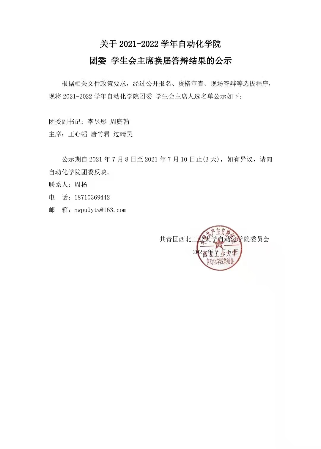 关于 2021-2022 学年动漫疯 团委 学生会主席换届答辩结果的公示