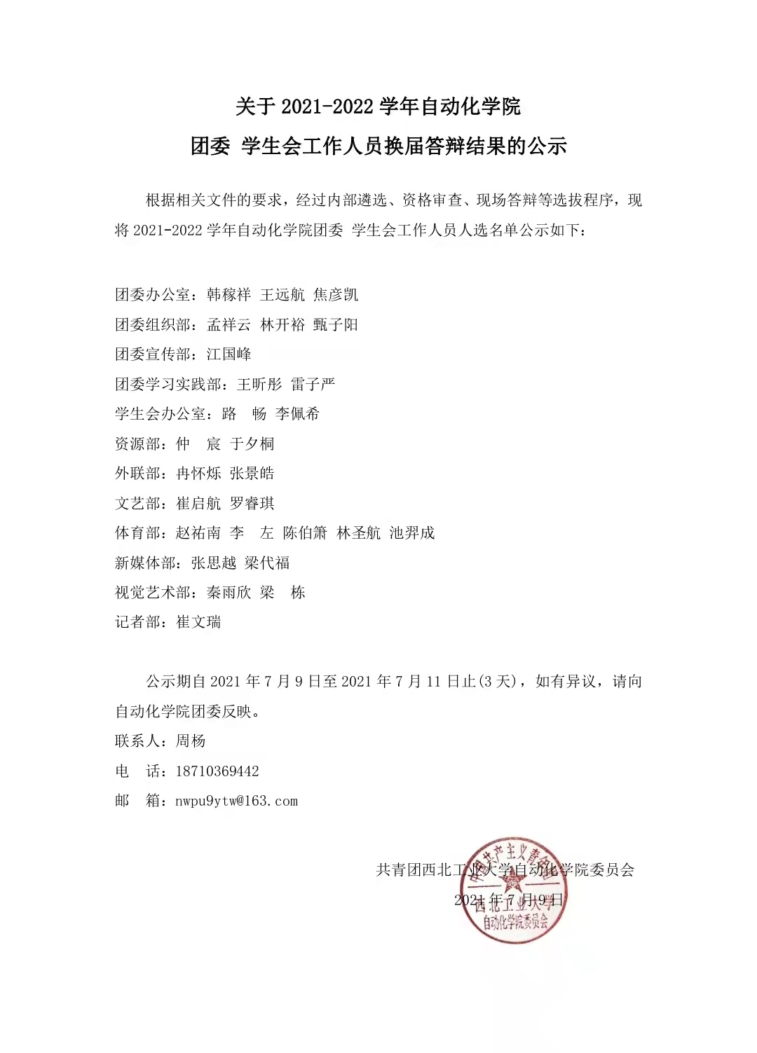 关于 2021-2022 学年动漫疯 团委 学生会 工作人员换届答辩结果的公示